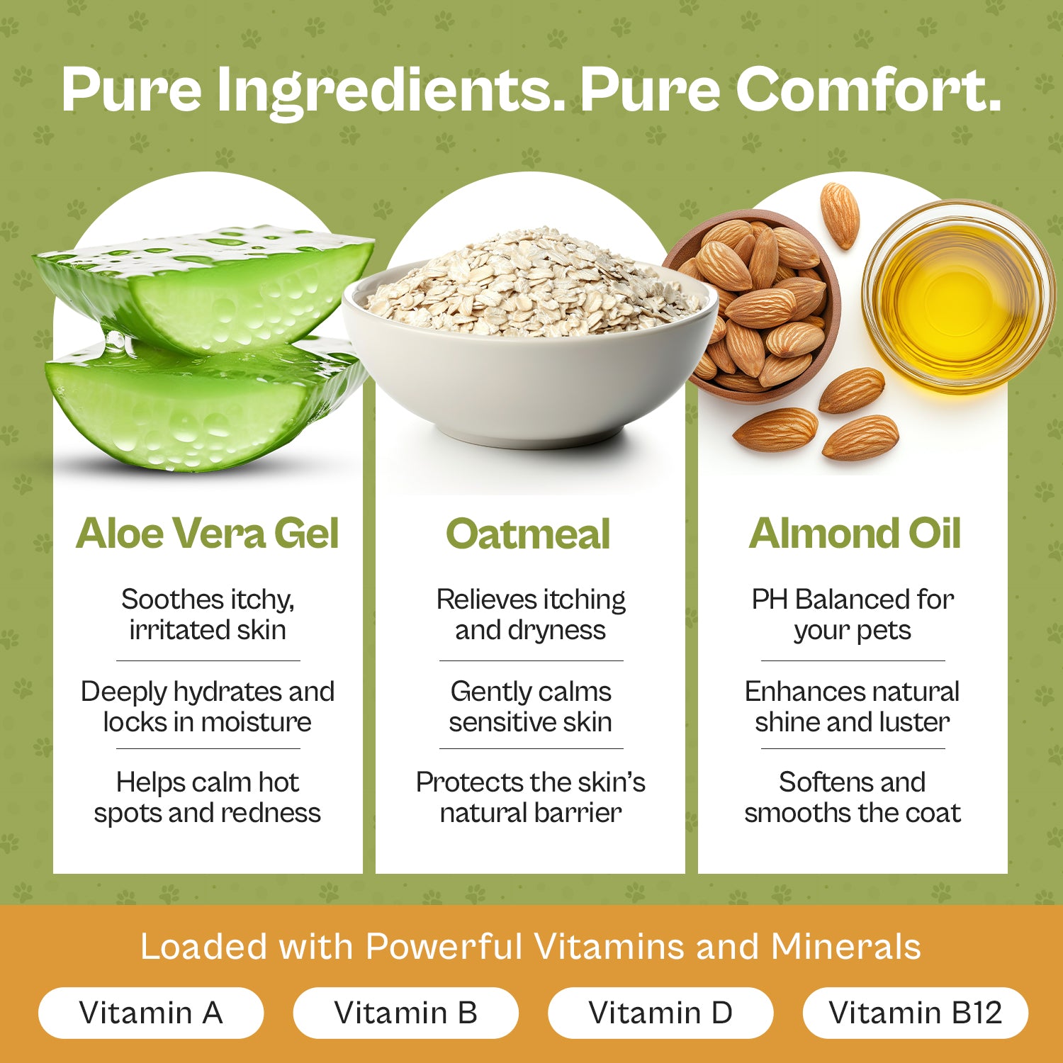 Gentle plant-based ingredients like oatmeal, almond oil, and aloe support healthy skin and a shiny coat.